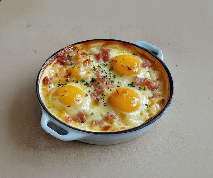 Grâce à une cuisson douce au bain-marie, les jaunes restent coulants tandis que le fromage apporte une onctuosité irrésistible.